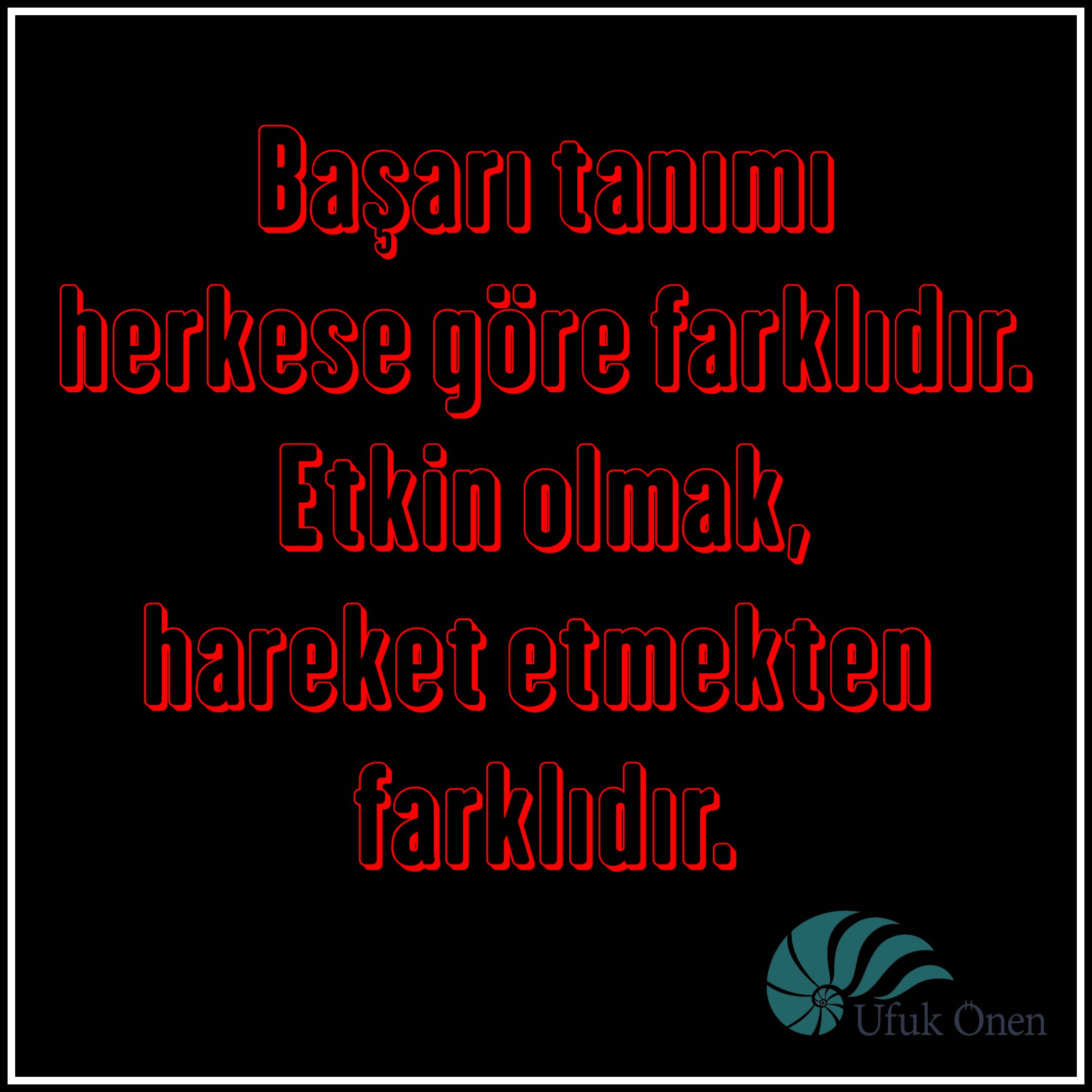 Başarı; anlamı ve tanımı kişiden kişiye değişiktir ki bu oldukça doğaldır. Başarılı olduğunuzu nasıl anlarsınız sorusuna gelen yanıtlar da kişiden kişiye değişmekle birlikte, bir insan belli bir konuda doyuma ulaştığında kendini başarılı hisseder ki sağlıklı olan da budur. Hareket etmek kendi başına etkin olmaktan çok daha farklıdır. Etkin hareketin bir hedefi ve çoğunlukla genel bir faydası vardır. 14/10/2021 İst.