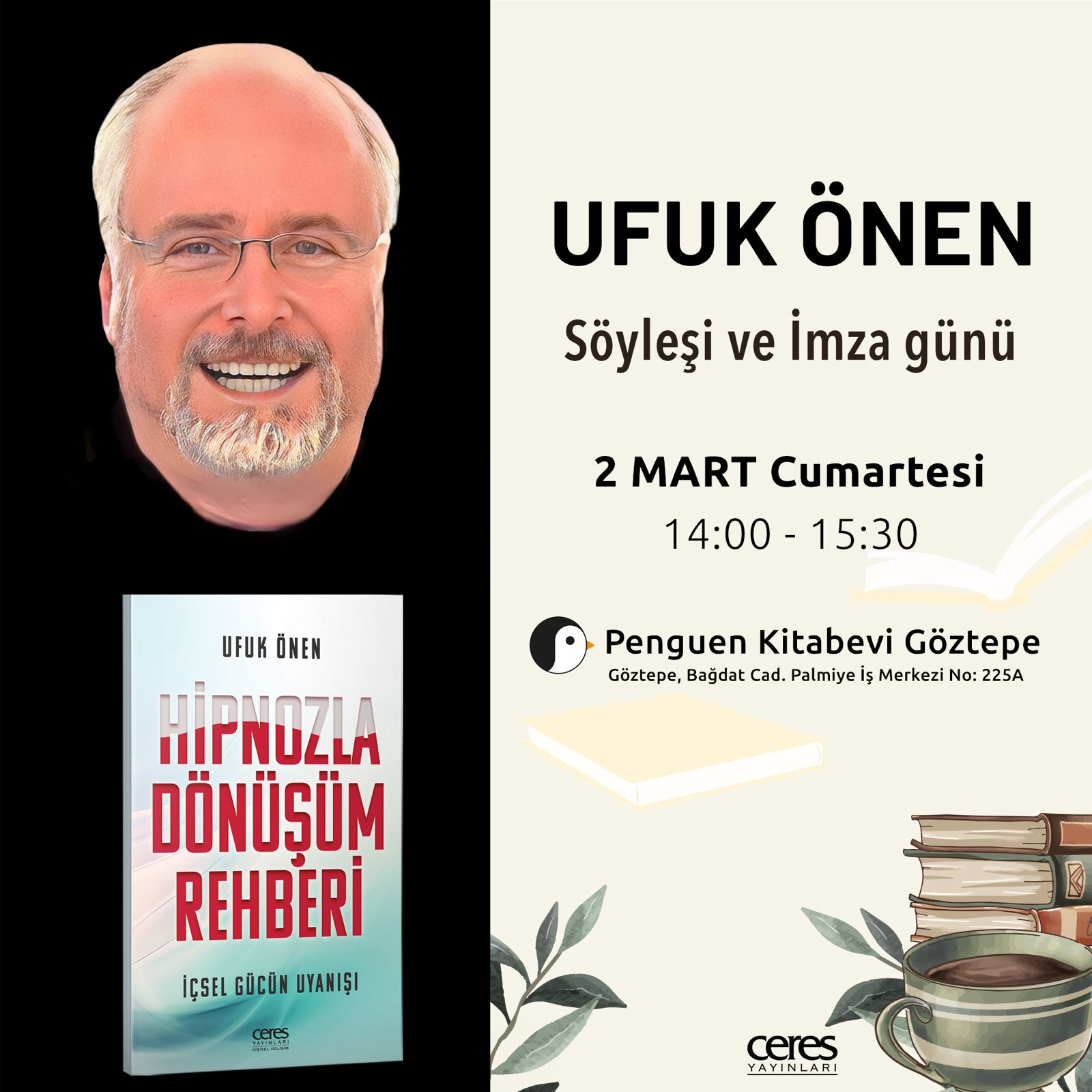 Göztepe Penguen Kitapevi Bağdat caddesi 225A, İstanbul, Kadıköy, TürkiyeUfuk Önen 'in ikinci kitabı Hipnozla Dönüşüm Rehberi için Göztepe Penguen Kitapevi ‘nde 2 Mart Cumartesi günü saat 14.00 ile 15:30 arasında yapılacak imza ve söyleşi gününe ilgi duyan herkes […]
