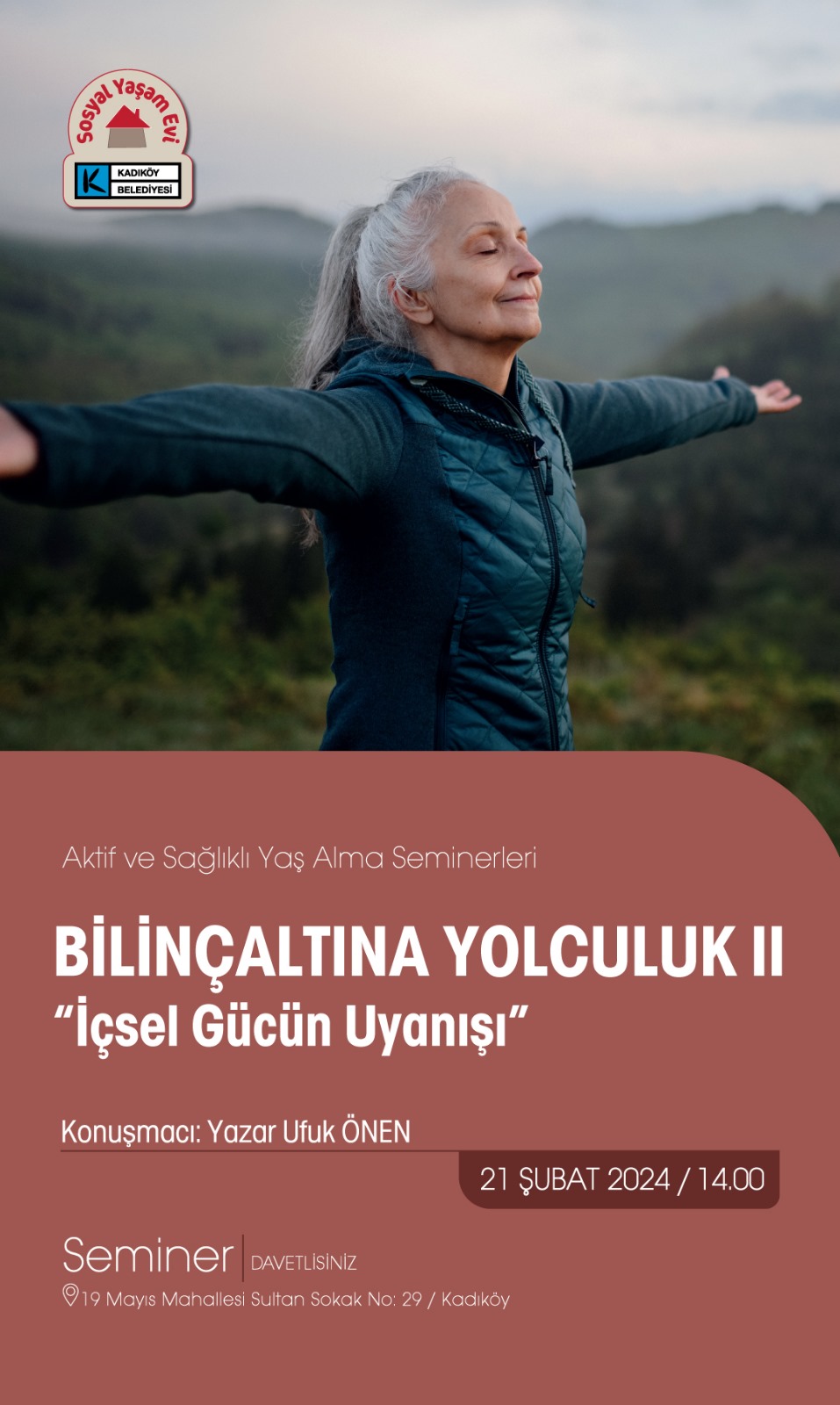 Sosyal Yaşam Merkezi 19 Mayıs Mah. Sultan sok. No: 29, İstanbul, TürkiyeBİLİNÇALTINA YOLCULUK 2 - İçsel Gücün Uyanışı 21 Şubat 2024 Sizi, sağlıklı yaşamın kapılarını aralamaya davet ediyoruz! Yaşamınızı dönüştürmek ve içsel potansiyelinizi keşfetmek için bir fırsat sunuyoruz. Bu seminer serisi, […]