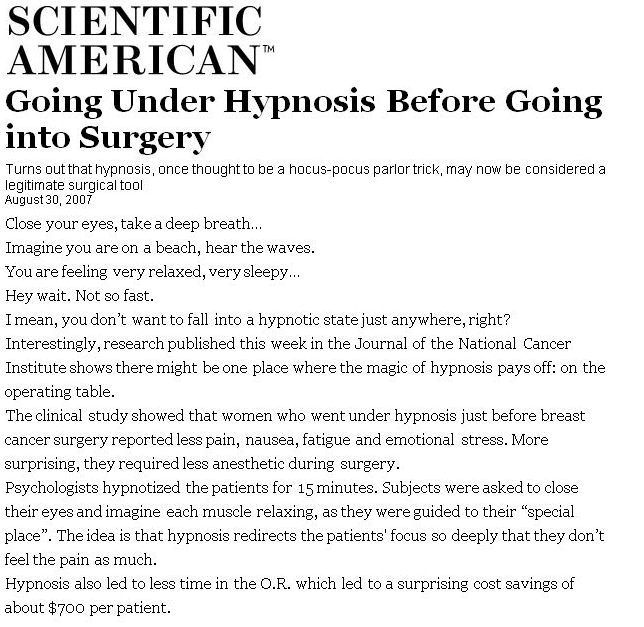 30.Ağustos.2007 tarihinde yayınlanan “Hipnoz ile yapılan ameliyatlar” konulu binlerce araştırma makalesinden biri.
